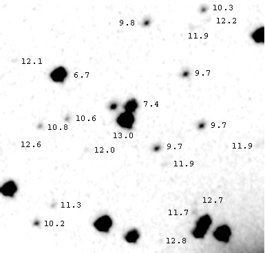 En la noche del 19 de junio dirigí la astrocámara CCD en dirección a León, en donde encontré la variable R Leonis perfectamente asequible al equipo: quizá demasiado asequible, porque es una estrella de tipo Mira (variable de largo período: 312,43 días), con oscilaciones de brillo entre la magnitud 4,4ª como máximo y 11,3ª como mínimo. Debido a su tipo espectral tan avanzado (M8IIIe) es un astro frío y, por tanto, fuertemente emisor en luz roja, de donde debería aparecer muy brillante para mi CCD. Así es: la imagen digital obtenida ofrece todos y cada uno de los astros en la zona que rodea a la variable, brillantemente luminosa para la astrocámara; las estrellas de comparación aparecen al lado: se ve que R Leo es escandalosamente más brillante que las demá s, pese a que visualmente brillaba cerca de la magnitud 7ª.