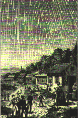 HistoriaLa historia de esta tormenta de estrellas fugaces va muy ligada al descubrimiento de la naturaleza del fenómeno. La noche del 12 al 13 nov 1833 una inusual actividad de meteoros (o estrellas fugaces) pudo obervarse desde América. Poco después de la puesta de sol se contempló una gran cantidad de meteoros. La actividad fue creciendo paulatinamente y tuvo su máximo nivel poco antes de la salida del sol, la madrugada del día 13. En ese momento, los meteoros inundaron todo el cielo, ofreciendo un espectáculo único y terrorífico para las gentes de la época. Agnes Clerke: "En la noche del 12 al 13 de noviembre de 1833 una tempestad de estrellas fugaces cayó sobre la Tierra. Todo el cielo estaba surcada de trazos y de majestuosos bólidos que iluminaban el cielo. En Boston, la frecuencia de los meteoros se estimó como la mitad de los copos de nieve que se ven en una fuerte tormenta".Aquella noche, muchas personas creyeron que había llegado el Día del Jucio Final. El hecho conmocionó a las gentes de aquella época. No en vano el historiador estadounidense R.M. Devens tenía en su lista a esta tormenta entre los eventos más importantes de EEUU. Devens escribió que "durante las tres horas del suceso, se creyó que el Juicio Final esperaba sólo a la salida del Sol y, aún muchas horas después del cese de la lluvia, los supersticiosos creían que el Día Final llegaría en sólo una semana". Este relato parece trasladarnos en el tiempo a las épocas de la Edad Media. Joe Rao afirma que para los EEUU la tormenta de las Leónidas de 1833 supuso una revitalización del fervor religioso que desde entonces y hasta nuestros días se han arraigado en forma de sectas. Pero el Apocalipsis de San Juan no se llegó a cumplir. ¿Cual era el origen real de los meteoros? Algunos periódicos se aventuraron a publicar algunas hipótesis. El diario Charleston Courier, por ejemplo, afirmaba que las estrellas fugaces eran gases, como el hidrógeno, que procedentes del Sol se incendiaban en la atmósfera debido a la electricidad o por la acción de partículas fosfóricas. El United States Telegraph de Washington (EEUU) tenía su propia teoría: "El intenso viento del Sur de ayer ha podido encontrarse con una masa de aire electrificado, que, debido al frío de la mañana, hizo descargar sus contenidos sobre la tierra".