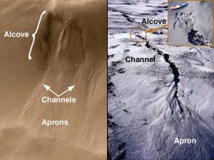 Comparación de la morfología de un afluente marciano con uno terrestre.La NASA se ha tomado con cierta tranquilidad este anuncio y, al contrario que en 1996 cuando anunció las evidencias de microbacterias en un meteorito, ha querido llevar este asunto por los cauces científicos y no por los políticos (por cierto, algo absolutamente inusual). Es muy probable que las agencias espaciales, incluida la europea, retoquen sus programas de exploración en vista de estas evidencias, y se lancen a buscar agua en latitudes medias. La conquista del planeta por parte de humanos es aún un sueño, aunque la localización de reservas de agua de fácil acceso en esas latitudes medias aumentaría considerablemente las posibilidades de alcanzarlo. Los responsables de la NASA, de todos modos, hacian incapié en que por mucho que quisiéramos, aún no hemos desarollado la tecnología suficientes para ir a Marte.